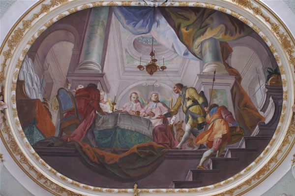 ![]() Das vordere Deckengemälde zeigt das Fischwunder: Ein Bote des Herzogs (vorne in Gelb gekleidet) überbringt Bischof Ulrich, der mit Bischof Konrad am späten Donnerstag Abend speist, eine Botschaft (mit Siegel). Ulrich lässt ihm ein Stück des Abendessens einpacken. Als der Bote seinem Herzog am Freitag Morgen das vermeintliche Fleischgericht zeigen will, hat es sich in Fisch verwandelt. |