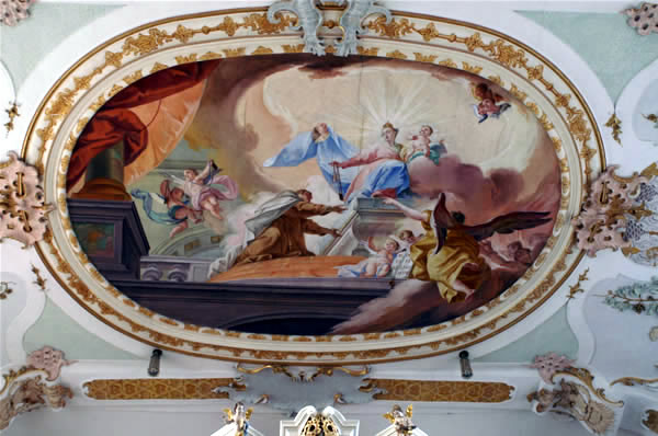 ![]() Hinteres Deckengemälde: Der Karmelitergeneral Simon Stock erhält das Skapulier (eine Art Unterpfand des Heiles) als Zeichen der Zugehörigkeit zur Skapulier-Bruderschaft. Diese Bruderschaft existiert auch in Eresing. |
