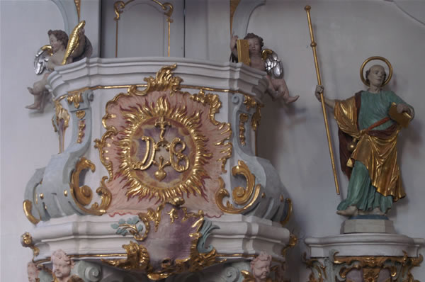 ![]() Die Kanzel trägt die Symbole für Glaube, Hoffnung und Liebe. Feuerkranz und Herz symbolisieren die Liebe. Im Kranz ist auch noch das Jesusmonogramm (IHS) enthalten. Die beiden Putten links und rechts gehörten ursprünglich zur Statue des Hl. Ulrich, die jetzt unter der Empore steht. Rechts Jakobus der Ältere |