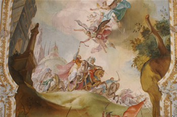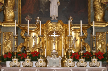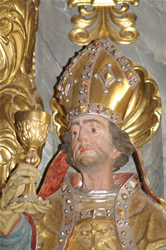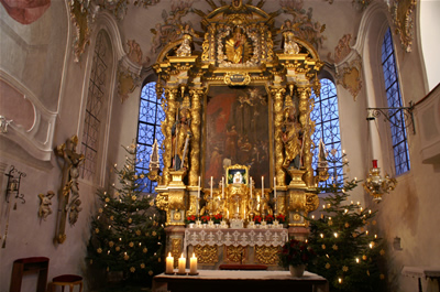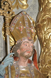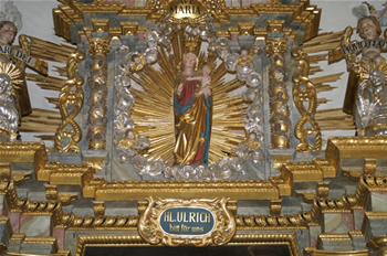 Der Innenraum ist reich verziert, links und rechts des Altars stehen die Statuen von Bischof Narcissus aus Gerona (Spanien) und Bischof Konrad von Konstanz, beide waren mit Bischof Ulrich befreundet. Geschaffen wurden die Statuen von Lorenz Luidl, erkenntlich an den hageren Gesichtszügen, die der Bildhauer allen seinen Werken verlieh. Dies stand in deutlichem Gegensatz zu den üppigen Körperformen der Gotik.
